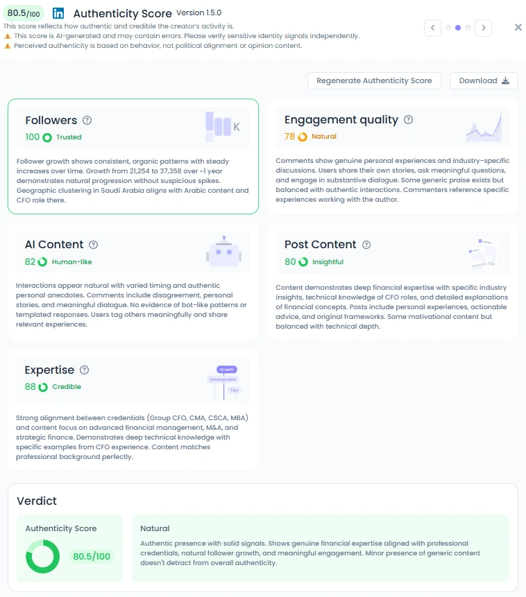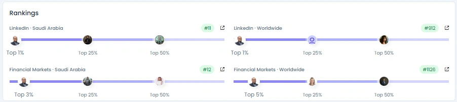 Influence Score: 7,304 pts. Followers grew organically from 21.2k to 37.3k over about a year, with steady daily gains. Engagement quality is “Natural,” driven by industry-specific discussions rather than empty hype. Rankings: LinkedIn Saudi Arabia top 1% (#11); Financial Markets Saudi Arabia top 3% (#12); strong global placements (#912 on LinkedIn worldwide and #1126 in Financial Markets).