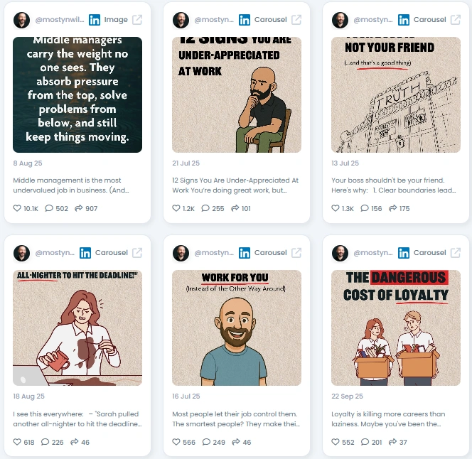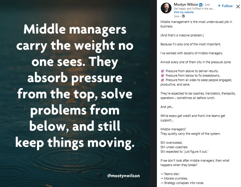 Mostyn helps managers breathe again. He translates messy corporate pressure into clear choices. His posts read like quick therapy for people carrying teams on their shoulders. Practical. Human. Shareable.