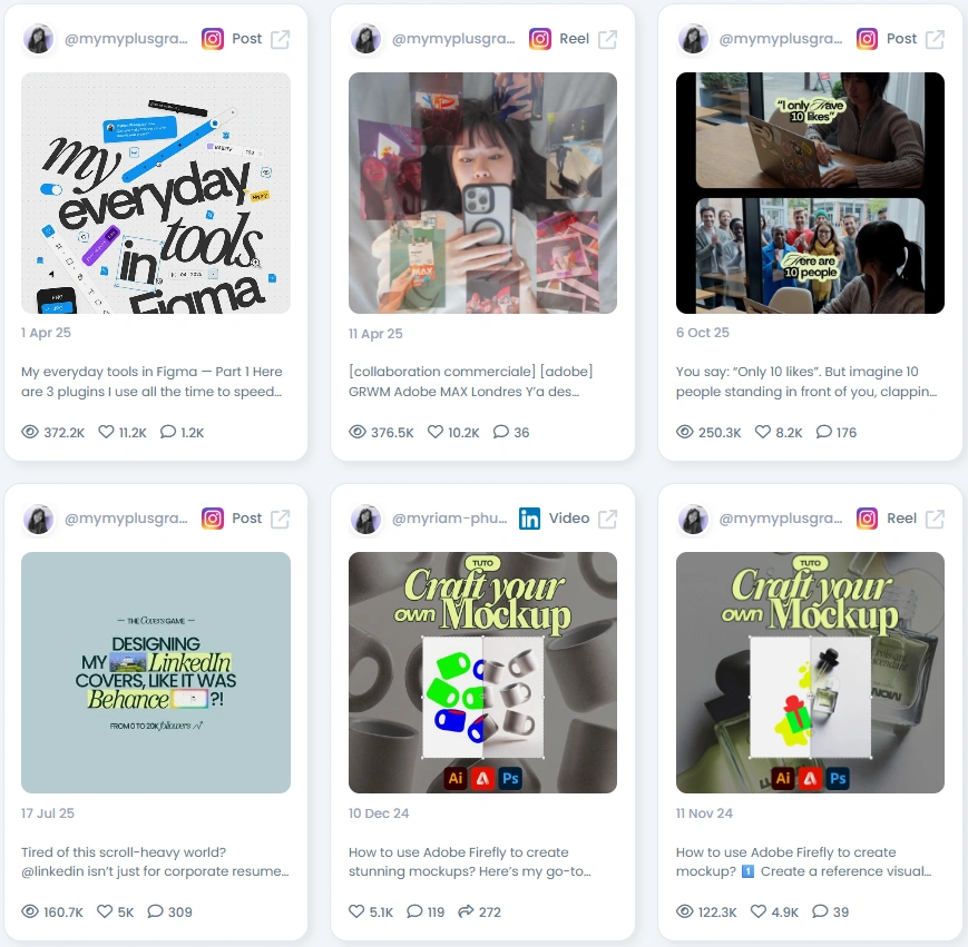 With an impressive Favikon Authenticity Score of 96.5/100, Myriam’s presence feels genuine and approachable. Her audience connects with her openness about creative challenges and her joy in sharing tools that make design more intuitive. Posts like “My everyday tools in Figma” or her reflection on engagement (“Only 10 likes? Imagine 10 people standing in front of you”) show how she balances expertise with authenticity. She inspires not through perfection but through process.