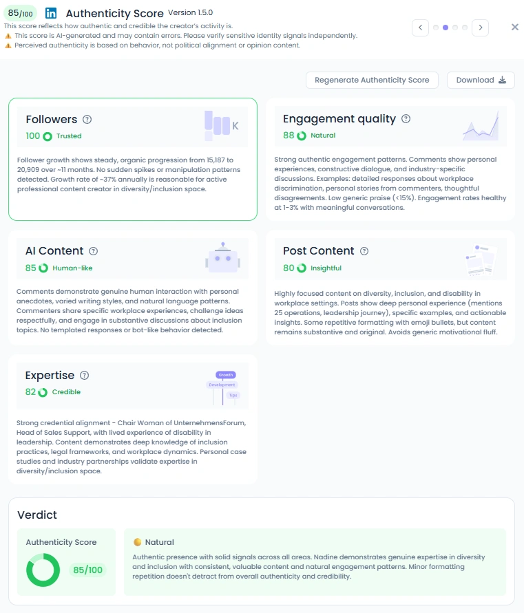 Nadine Schönwald's Authenticity Score Details