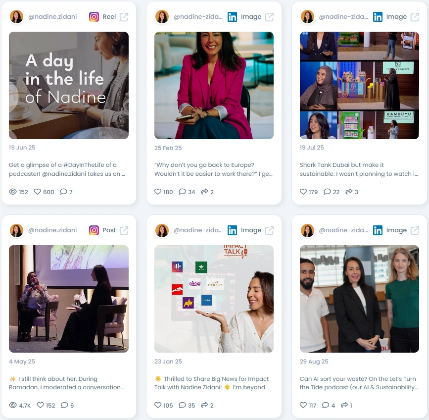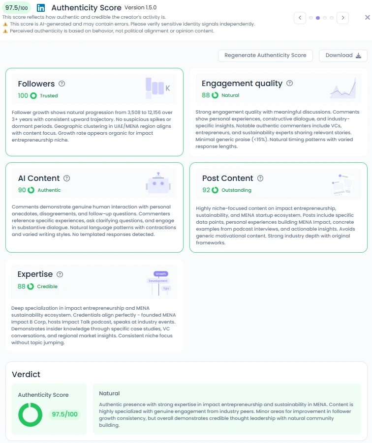 Nadine shines with a 97.5/100 Authenticity Score, and it shows. Her comments include genuine conversations with VCs, sustainability experts, and peers who challenge and enrich her viewpoints. Her posts include real stories from building MENA Impact and interviewing change makers. She avoids the “motivational quote trap” and instead shares data, frameworks, and lived experiences. Her content feels credible because it comes from practice, not theory. People trust her because she shows her work.