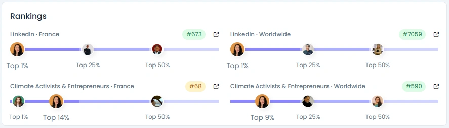 Nadine’s audience has grown consistently from 3,500 to more than 12,000 followers in a few years. Her growth curve is steady and natural, making her one of the most trusted sustainability voices in the MENA region. With an Influence Score of 5,531 points, she ranks in the top 1 percent on LinkedIn in France and the top 1 percent worldwide among sustainability creators. Engagement is strong, with meaningful comments, long discussions, and a constant exchange of insights across her posts.