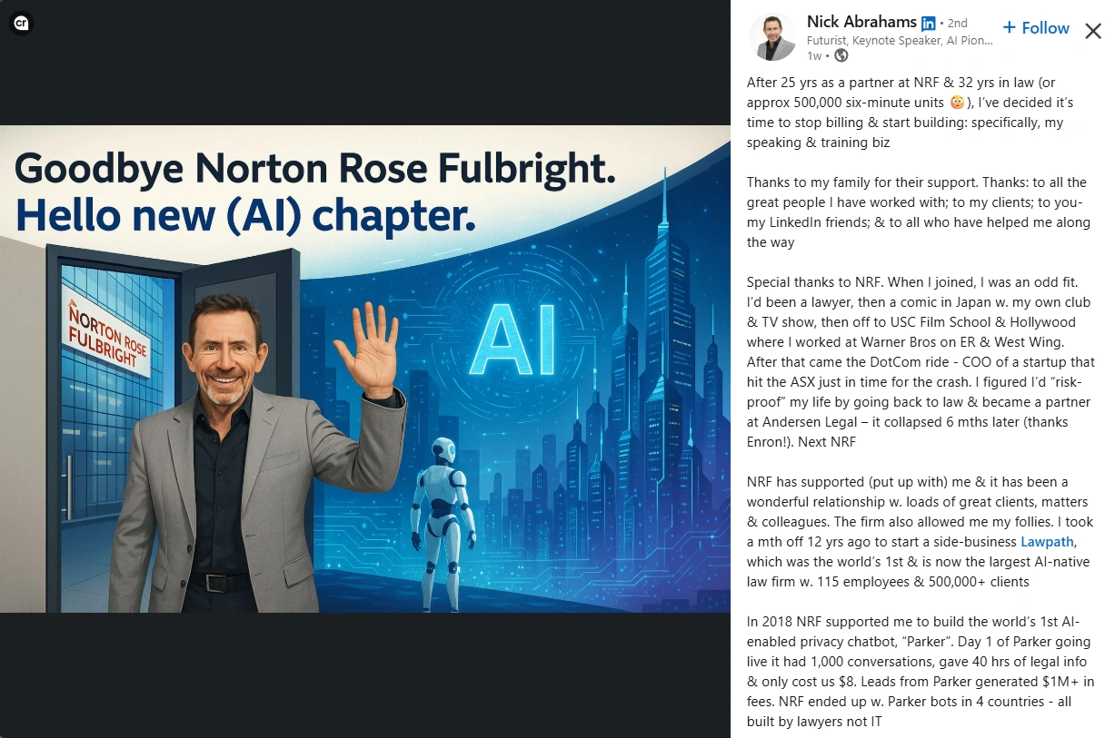 Nick Abrahams has mastered the art of making innovation approachable. His content cuts through the jargon and invites professionals to think differently about their industries. By combining deep experience with humor and humanity, he redefines what thought leadership in law looks like. In a time when AI challenges every profession, Nick stands as a reminder that the future doesn’t have to be feared. It can be learned, shared, and even laughed about.