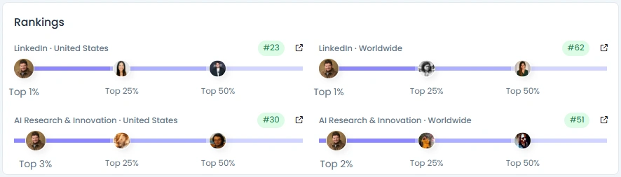 Nick has a trusted following of over 57K, built gradually through steady, organic growth. His Influence Score of 8,217 points places him in the Top 1% of LinkedIn creators worldwide and within the Top 2% in AI Research & Innovation. His engagement rates are consistently strong, with thousands of reactions and hundreds of thoughtful comments per post. From launch updates to hiring calls, his content sparks real conversation rather than superficial engagement.