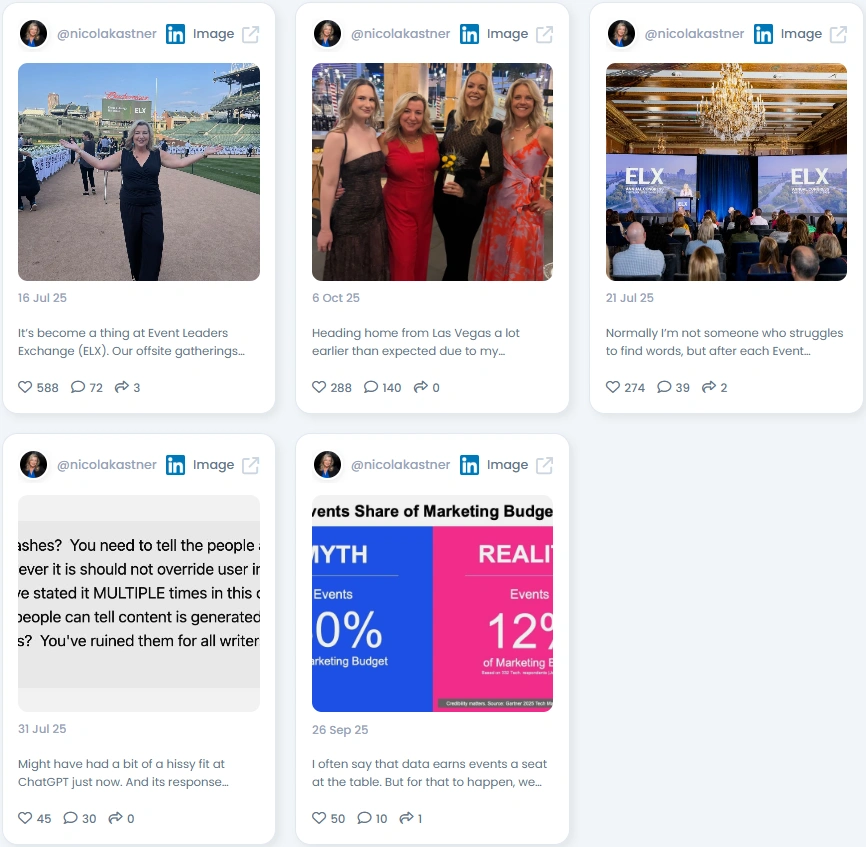 Nicola’s posts mix insider insights with a refreshing sense of humor and self-awareness. She talks about real issues in event marketing, from data analytics to AI tools, but never loses her human touch. Her “ChatGPT hissy fit” post or behind-the-scenes reflections from ELX summits remind followers that leadership is about authenticity, not perfection. Her feed is a space where professionals come to learn, laugh, and rethink what event strategy really means.
