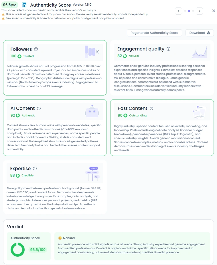 With an Favikon Authenticity Score of 96.5/100, Nicola’s presence feels real and unfiltered. She shares professional insights and personal anecdotes, often mixing candid reflections with industry takeaways. Her tone is conversational and grounded, and her audience engagement proves it. Comment sections under her posts often turn into thoughtful discussions between executives, strategists, and marketers. This ability to bridge experience with relatability is what makes Nicola’s influence stand out.