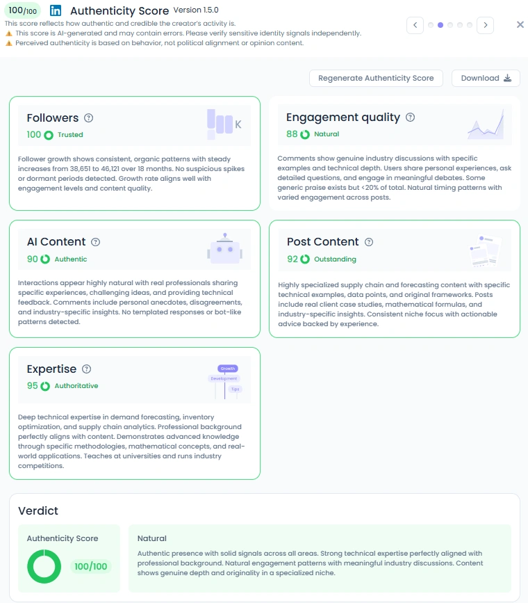 With a Favikon Authenticity Score of 100/100, Nicolas is the definition of credible. His content blends technical insight with a personal touch, whether he’s posting from an airport before visiting a client in Chicago or breaking down a forecasting metric like MAPE vs. MAE. His audience includes seasoned analysts who challenge his ideas and students eager to learn, creating a genuine exchange of expertise in the comments. Every post feels authentic, educational, and deeply grounded in lived professional experience.