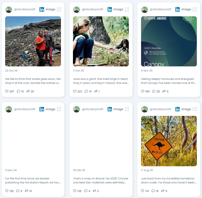 People pay attention because Nicole combines evidence with clear next steps. She frames big problems in supply chains and then shows brands how to change purchasing, certify alternatives, and track impact. Her posts mix field photos, hard numbers, and direct asks that invite partnership. She is unafraid to call out bad practices while offering realistic solutions, which earns trust from both buyers and activists.