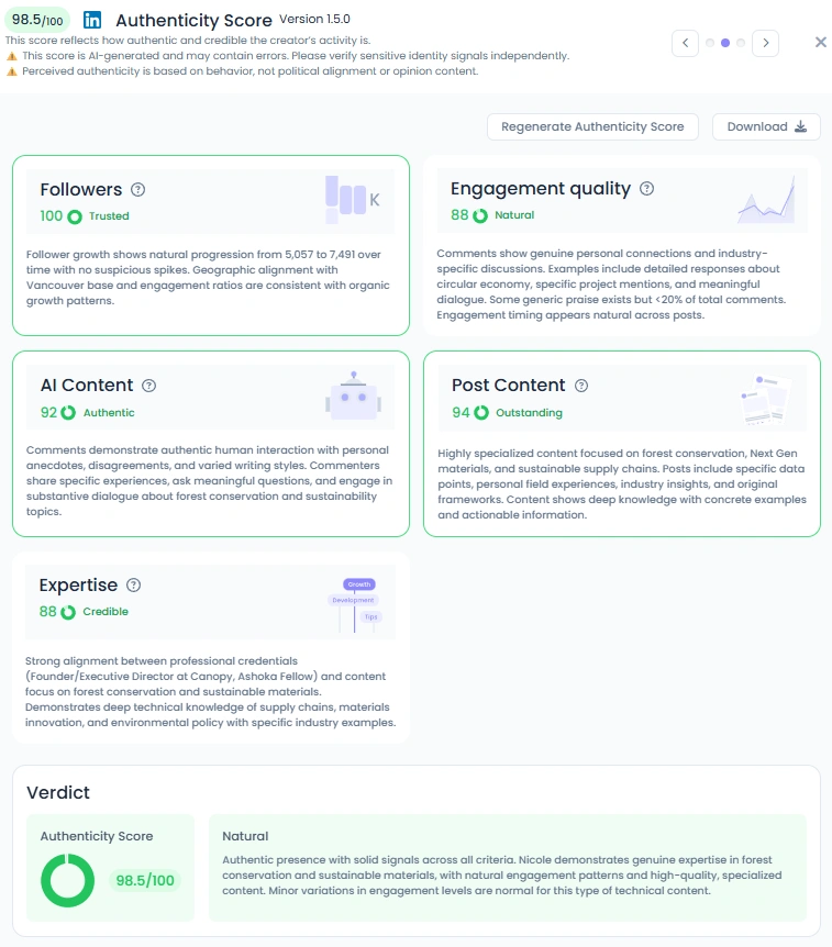 Favikon scores Nicole 98.5 out of 100 for authenticity. Her content reads as expert and human. She shares field trips, campaign wins, and candid reflections on policy progress. Comments on her posts show substantive engagement, including technical questions and collaborative ideas. That level of transparency makes her authority feel grounded and earned.