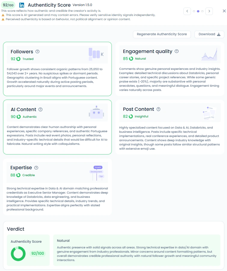 With an Authenticity Score of 92 out of 100, Nilton stands out as a highly credible voice in the data community. His content is full of personal reflections, technical details, and real-world experiences. These are not AI-generated summaries. They are thoughtful posts written in authentic Portuguese, using casual language, emojis, and storytelling.