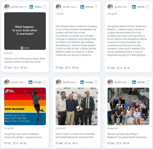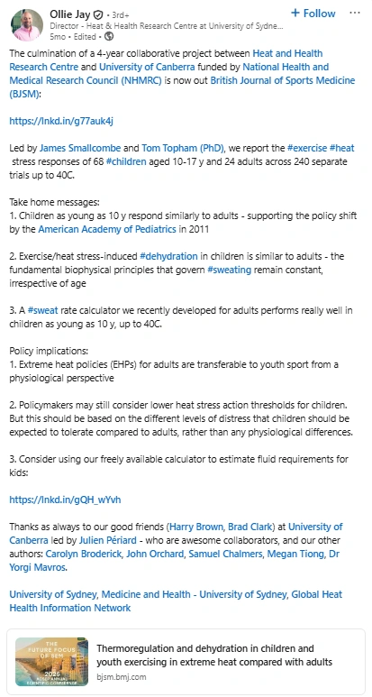 Ollie Jay makes heat science useful. He explains complex physiology in plain language and backs it with data. His posts blend research updates, tool releases, and clear policy takeaways. People follow him for reliable evidence and practical guidance on heat and health.