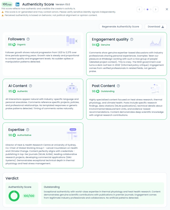 His Authenticity Score is 100 out of 100, which matches the tone of his feed. Ollie posts real study summaries, team photos, and step by step findings. Comments come from verified professionals and collaborators. His content reads like expert knowledge shared to help others, not to perform.