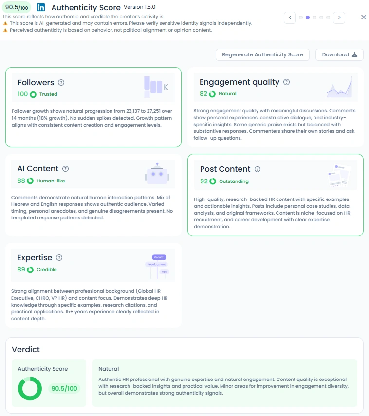 Or holds an Influence Score of 7,132 points, ranking in the Top 1% of LinkedIn creators in Israel and the Top 1% in the HR Industry worldwide. His following of over 27,000 professionals has grown steadily, supported by consistent engagement and high-quality insights. His Engagement Quality Score of 82 and Expertise Score of 89 confirm what his followers already know, that Or’s presence is credible, trustworthy, and refreshingly real.