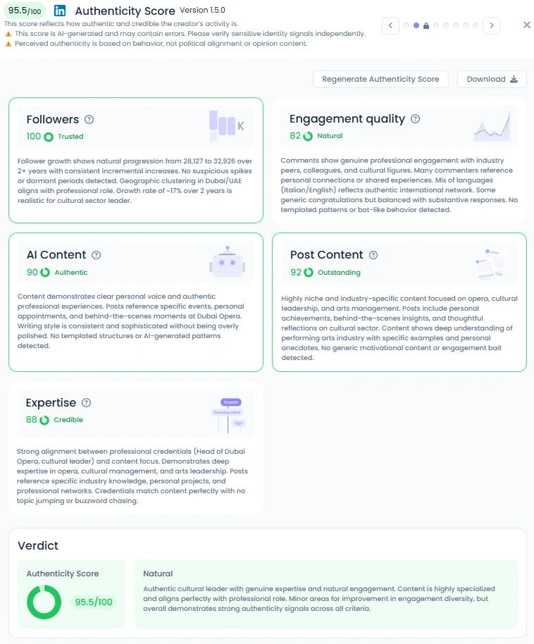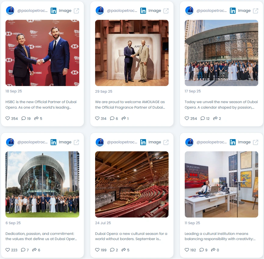 With a Favikon Authenticity Score of 95.5/100, Paolo embodies professional credibility and personal integrity. His growth from 28K to 32.9K followers reflects steady engagement from peers, industry figures, and cultural enthusiasts. His content mixes elegant visuals from Dubai Opera with reflections on leadership and collaboration. Every post feels personal yet polished, striking a balance between authority and warmth.