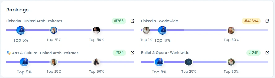 Paolo holds an Influence Score of 7,502 points, ranking in the Top 6% of creators in the UAE and the Top 8% worldwide in Ballet & Opera. His posts receive consistent engagement, with an Engagement Quality Score of 82 and Post Content Score of 92. He publishes regularly, spotlighting partnerships, performances, and achievements that strengthen Dubai’s global artistic footprint.