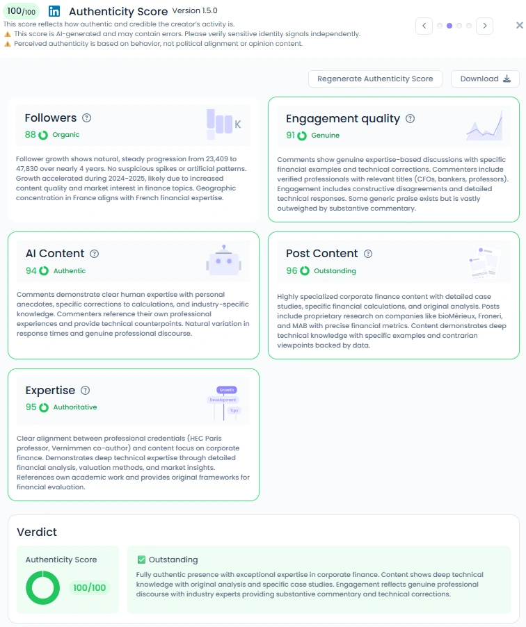 With a Favikon Authenticity Score of 100 out of 100, Pascal’s content demonstrates genuine expertise and transparent engagement. His posts feature original calculations, case studies, and practical examples from major companies. Comments often come from CFOs, bankers, and financial analysts who add their own insights, creating a collaborative learning space. His writing shows consistency and purpose, staying focused on education and intellectual honesty rather than self-promotion. This makes him one of the most trusted financial voices in France.