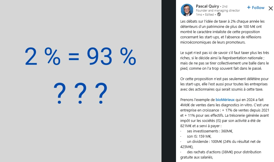 Pascal Quiry is a finance expert and professor at HEC Paris, one of Europe’s top business schools. He is also a co-author of the Vernimmen, a leading corporate finance reference book used by students and executives worldwide. Over the years, he has built a career that combines teaching, research, and industry experience with companies like BNP Paribas and Vivendi. His approach to finance is both analytical and educational, making complex topics understandable to a wide audience. Through his posts, he brings technical accuracy to LinkedIn while fostering open discussions about current economic events.