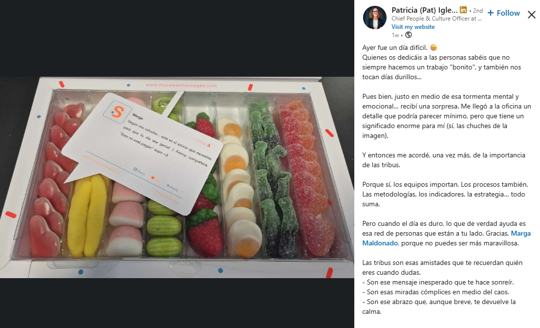 Pat collaborates with HR communities, media, and training programs across Spain and LATAM. You’ll see RRHH Digital, Programmatic Spain, and Techsoulogy projects in her orbit. Her comments include HR directors, founders, coaches, and professors. The mix gives her reach from classrooms to C-suites.