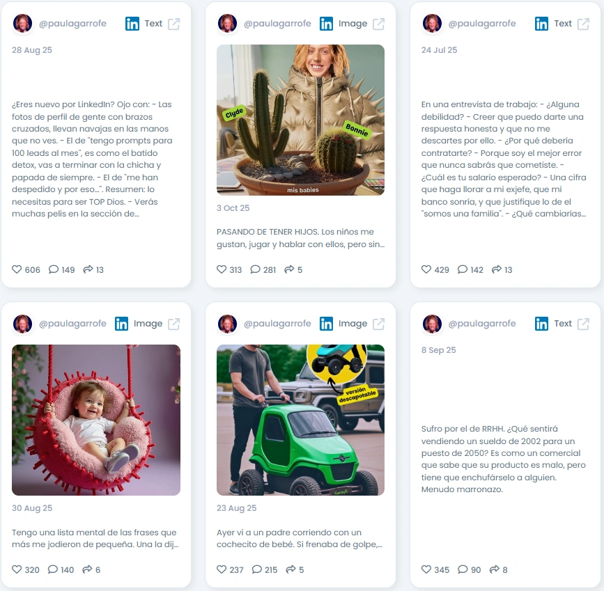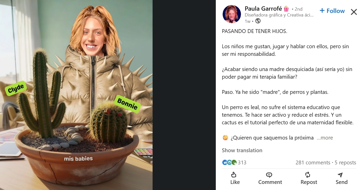 Paula Garrofé doesn’t just create visuals, she tells stories through them. Known for her bold, witty, and unapologetically human take on branding and social media, she’s one of Spain’s most distinctive creative voices on LinkedIn. Her posts blend humor, design insight, and cultural commentary, turning everyday topics into viral moments that hit both heart and brain.
