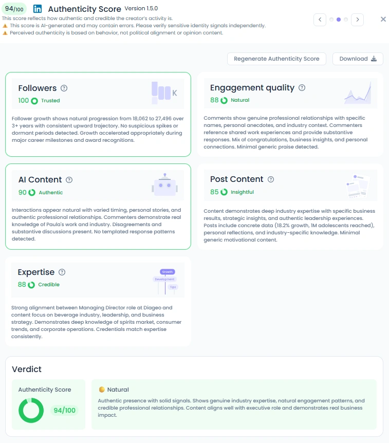 Favikon rates her authenticity at 94/100. Comments read like real colleagues and industry peers, not a claque. She shares concrete business outcomes, personal reflections, and community stories without over-polishing. Even tough topics spark constructive discussion, which keeps trust high.