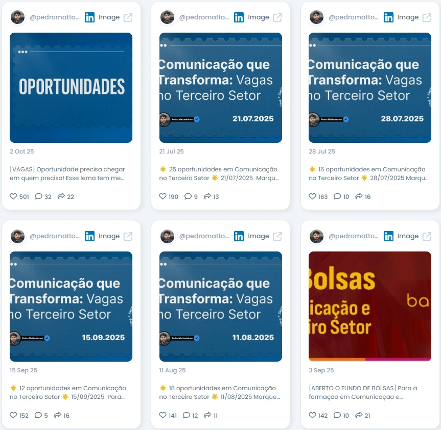 Pedro helps good ideas grow into real impact. He is a practical strategist for Brazil’s social sector who shares jobs, tools, and playbooks that teams can use today. His voice is clear, upbeat, and anchored in data. If you work in nonprofits or advocacy, his feed feels like a weekly ops meeting that actually solves things.