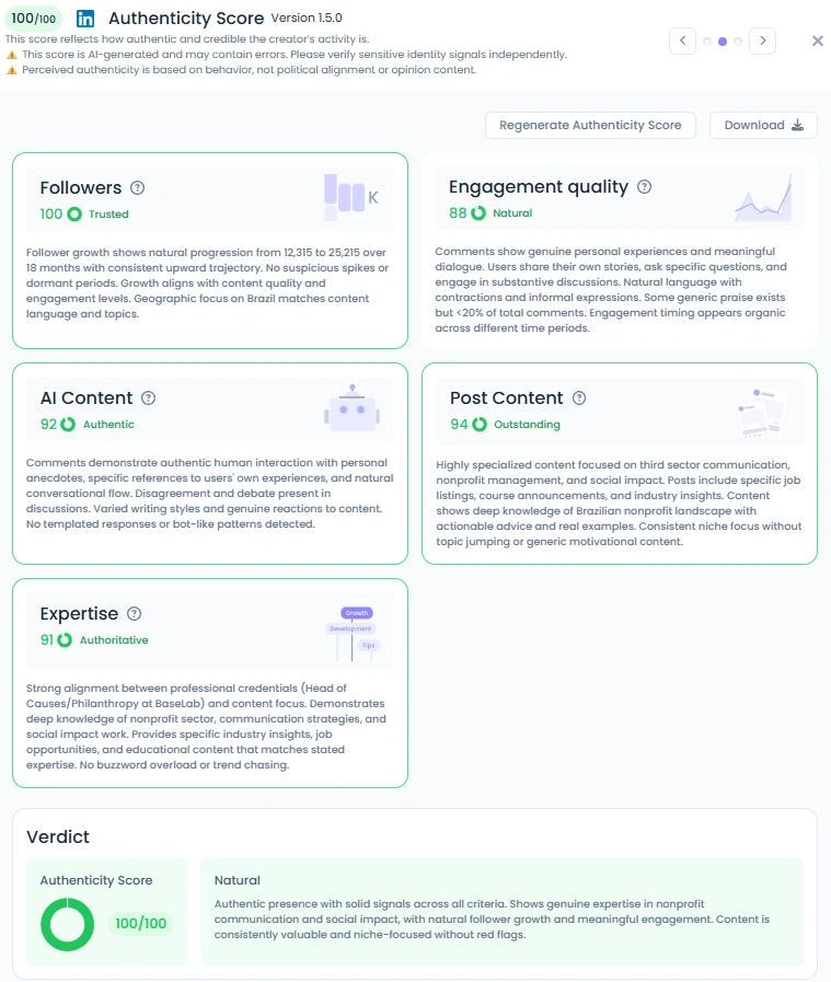 Favikon gives him 100/100 for Authenticity. Engagement quality sits at 88, with lively back-and-forth in the comments. AI Content 92, Post Content 94, and Expertise 91 show a consistent human voice and niche mastery. His content stays focused on Brazil’s nonprofit reality with real examples, not slogans.