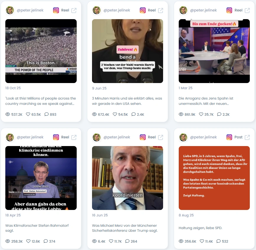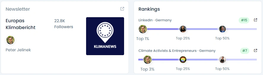 Peter’s follower base has grown from 13,532 to over 51,252, showing organic, sustained growth driven by meaningful dialogue. His Influence Score of 8,171 points places him in the Top 1% on LinkedIn Germany and Top 3% among Climate Activists & Entrepreneurs. His videos regularly reach audiences in the hundreds of thousands, with engagement rates that reflect real trust rather than viral luck.