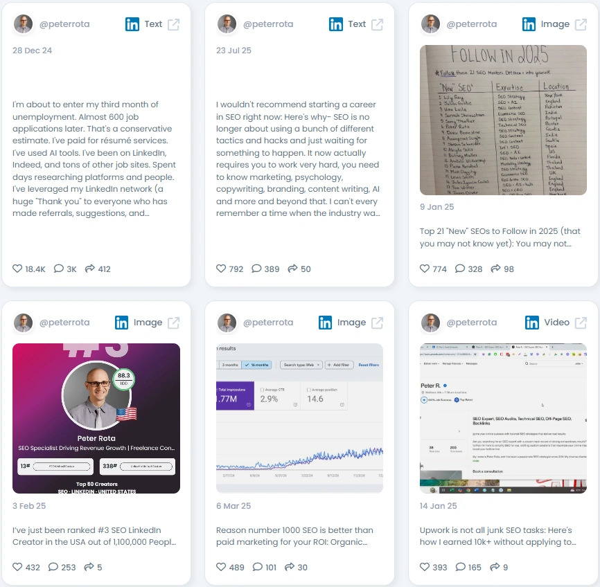 Peter Rota has built a reputation as one of LinkedIn’s most trusted voices in SEO. His content blends technical precision with personal authenticity, making him a go-to figure for professionals who want results, not jargon. Whether he’s breaking down search algorithm updates or sharing his own job-hunting journey, Peter brings clarity and credibility to a complex industry.