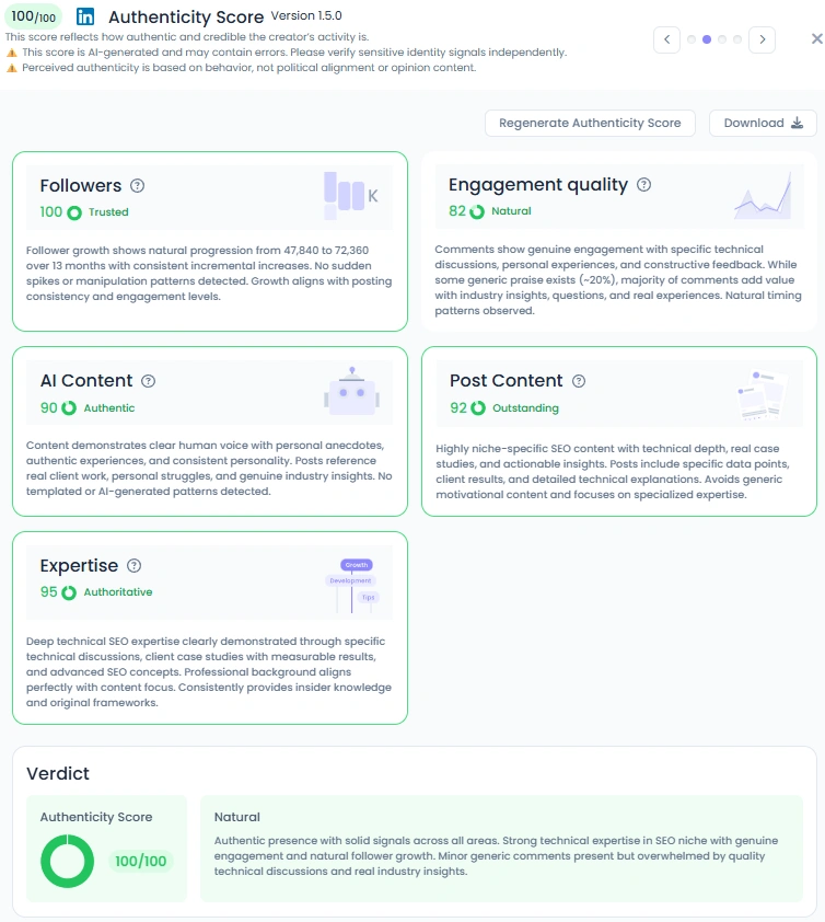 With an Favikon Authenticity Score of 100/100, Peter sets the benchmark for what a credible creator looks like. His posts are rich in technical detail yet full of personality. He shares personal reflections on job searches and client work alongside data-driven insights, creating a consistent and genuine presence. His follower growth is organic, his engagement natural, and his tone unmistakably human. That blend of expertise and empathy makes his content stand out in an AI-saturated landscape.