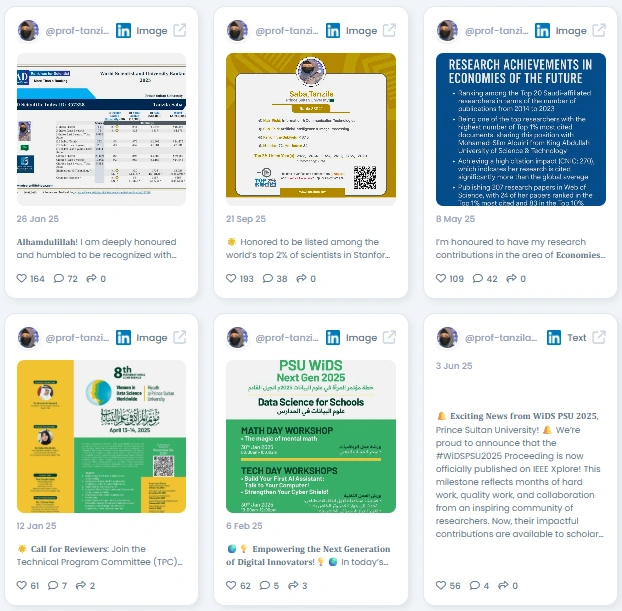 Prof. Tanzila’s posts combine intellect with humility. She celebrates achievements but always shares credit with teams, students, and collaborators. Her updates on conferences, publications, and recognitions serve as both inspiration and motivation for aspiring academics. Followers appreciate her blend of gratitude, professionalism, and encouragement a tone that turns milestones into community moments.