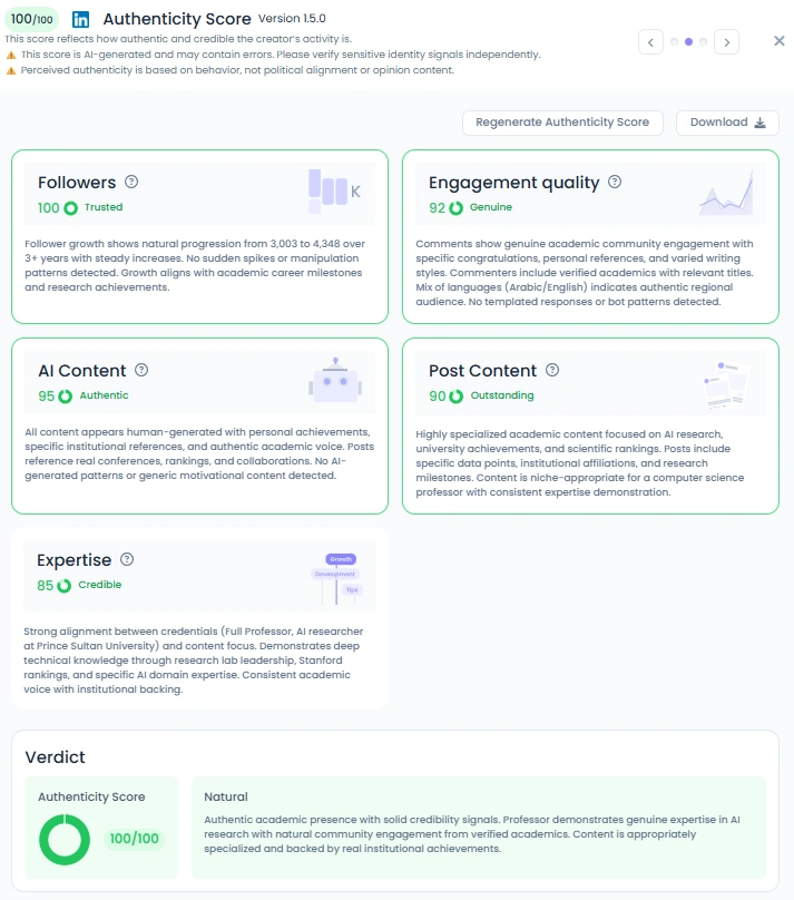 Her Favikon Authenticity Score stands at 100 / 100, a reflection of genuine, human communication. Her content is free from automation or AI templates, filled instead with heartfelt appreciation, academic insights, and bilingual engagement in Arabic and English. Comments often come from verified professors and researchers, adding depth to her digital footprint. Prof. Tanzila’s authenticity makes her one of the most trusted academic voices in AI research.