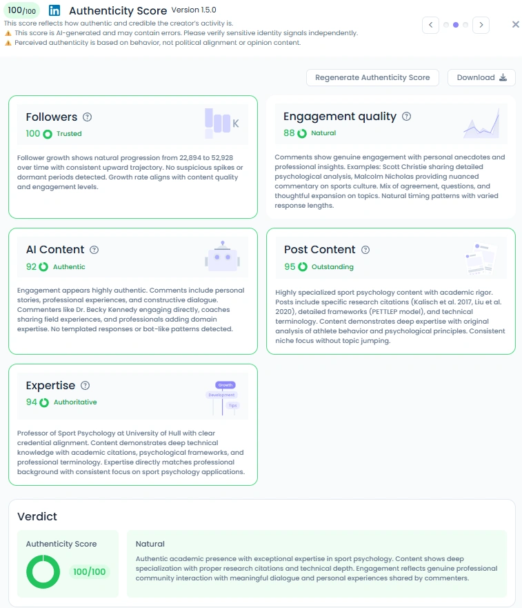 With an Favikon Authenticity Score of 100/100, Nicholls is as genuine as they come. His followers see a natural voice that avoids jargon for clarity while still backing up ideas with credible research. Engagement often includes coaches and psychologists sharing their own experiences, sparking thoughtful dialogue instead of empty likes. From sharing clips of athletes overcoming setbacks to breaking down stress responses, his posts feel rooted in both expertise and empathy.