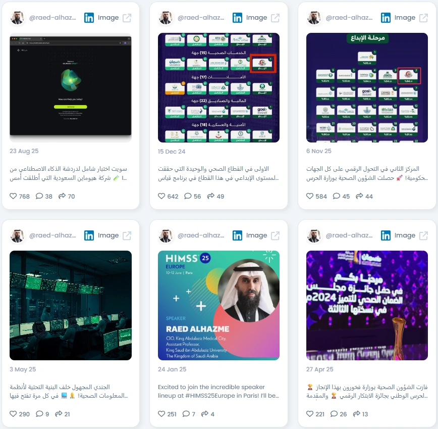 Raed is a senior health informatics leader and CIO driving digital transformation across major healthcare institutions in Saudi Arabia. His background spans academic research, technical implementation, and executive leadership. He has contributed to national scale programs, digital health acceleration, and AI integration in medical environments. His posts reflect real work inside command centers, national reporting systems, and transformation projects. He positions himself as a practitioner who understands both the strategy and the on the ground execution. His mix of experience and credibility makes him a trusted voice in the region.