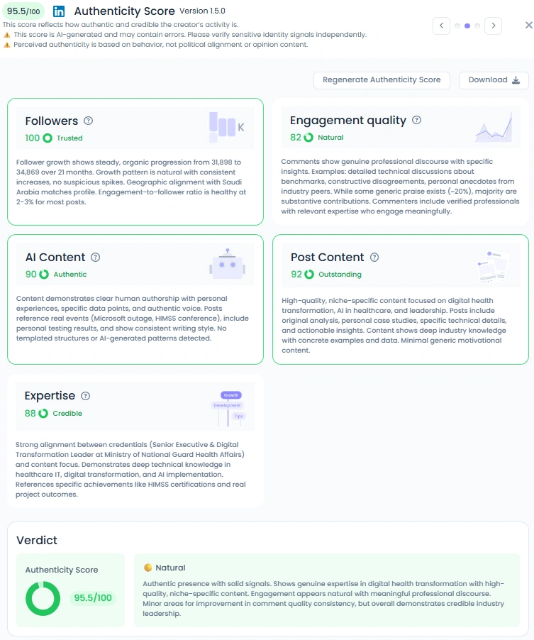 Raed holds a strong Favikon Authenticity Score of 95.5 out of 100. His posts include real command center photos, event updates, personal achievements, and references to actual national programs. His writing is natural and consistent. Engagement comes from professionals who ask technical questions or share their own experience. Everything points to a credible and grounded industry presence.