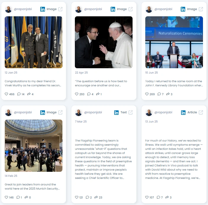 His network reaches government, academia, and mission-driven biotech. He appears alongside White House advisors, global health institutions, and innovation partners. Flagship Pioneering is central to his professional footprint, and he engages with policy makers, scientific leaders, and philanthropic actors. This network gives him both the reach to influence decision making and the partnerships to pilot new approaches.