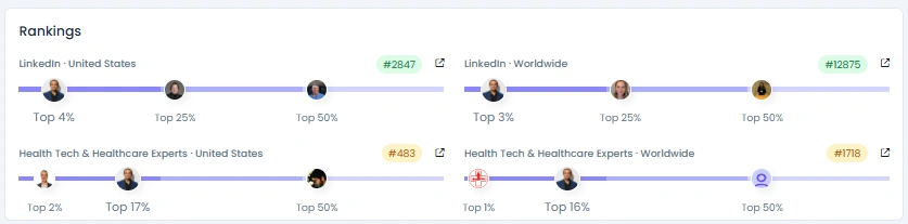 His follower growth shows a steady rise from about 18,500 to over 21,200, which signals organic professional interest. Engagement quality is strong, with meaningful comments and peer conversations around global health topics. Post content and AI content indicators score in the low to mid 90s, and expertise is rated highly at 96. He posts around major events, reports, and program announcements, producing consistent spikes of engaged discussion.