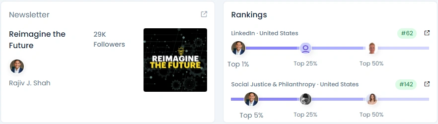 Rajiv has scaled his influence with consistency and credibility. His LinkedIn following grew organically from 59,610 to 164,805, supported by a strong global distribution. His Influence Score stands at 8,235 points, ranking him in the top 1% of LinkedIn voices in the U.S. and top 5% in social justice and philanthropy worldwide. His newsletter, Reimagine the Future, has over 29,000 followers, extending his reach with long-form insights.