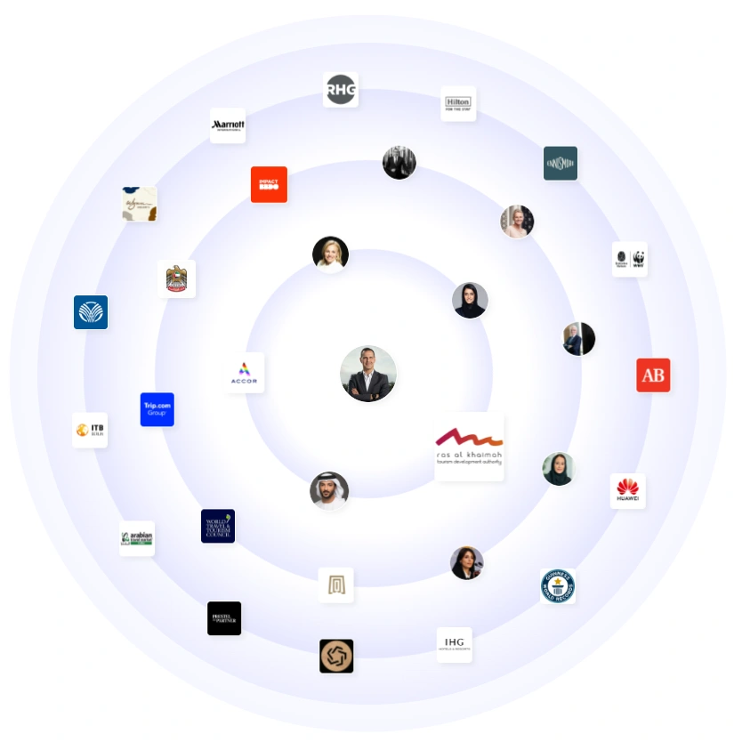His orbit features global hotel groups and travel platforms: Marriott, Hilton, Radisson, Accor, IHG, Trip.com, and ITB Berlin. Regional institutions, ministers, and business leaders appear alongside sustainability groups and media. Brand partners from tech and culture also show up, creating reach from policy rooms to resort lobbies. It’s a high-trust mix that accelerates investment and storytelling.