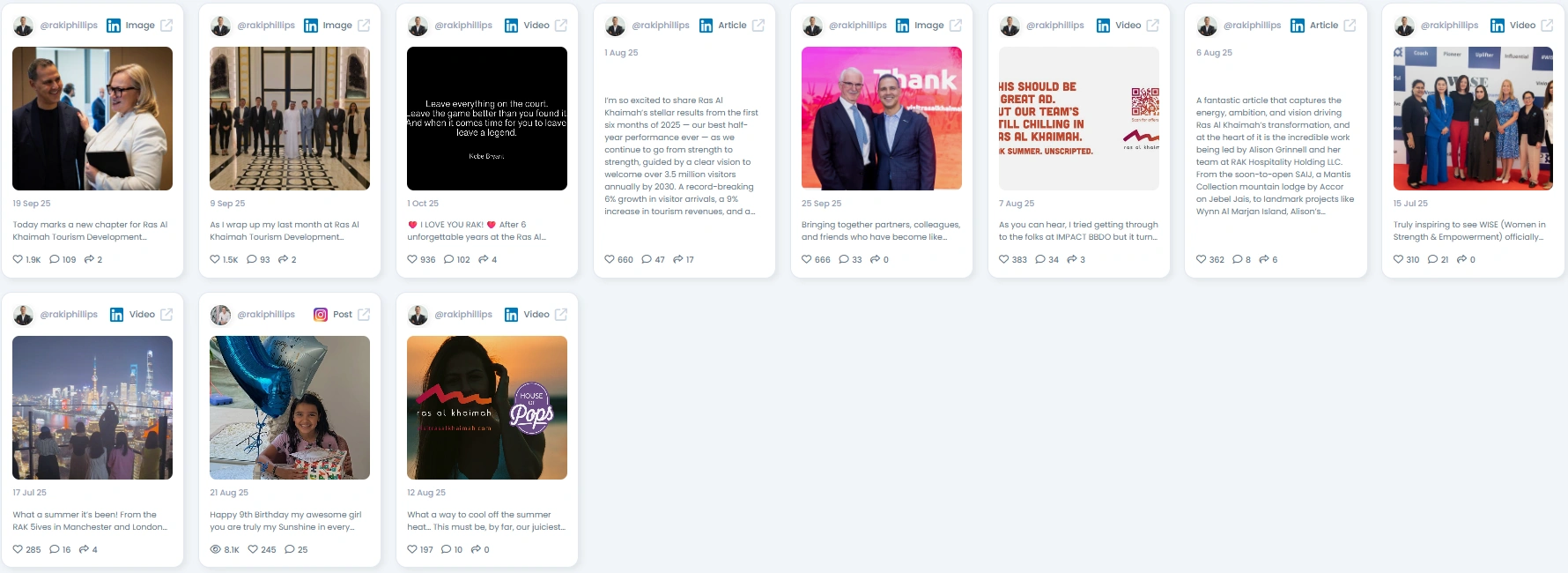 Raki champions animal welfare and sustainability in tourism. He highlights responsible development, conservation efforts, and programs that protect the emirate’s natural assets. Posts celebrate partners who cut impact while raising service standards, and he regularly connects visitor growth to community benefit. The message is consistent: destination success should be shared and sustainable.