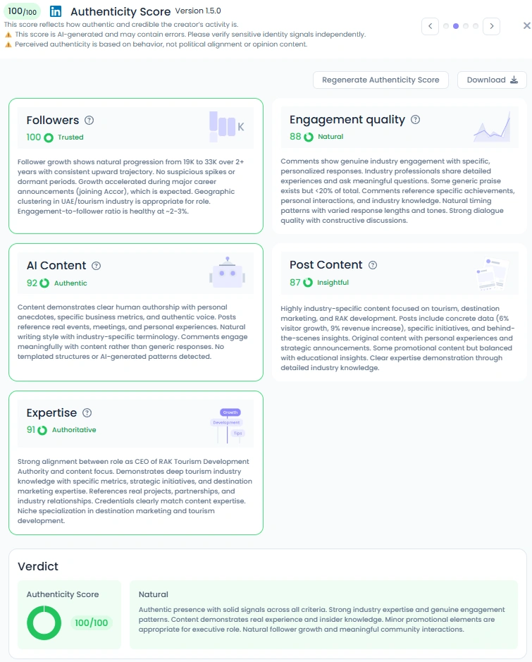 Follower growth rose naturally from roughly 19k to 33k over two years. Influence Score sits around 7,338 pts. Engagement quality is 88 “Natural,” AI signals are 92 “Authentic,” and expertise scores 91 “Authoritative.” Posting rhythm is steady across images, short videos, partner highlights, and articles that break down results.