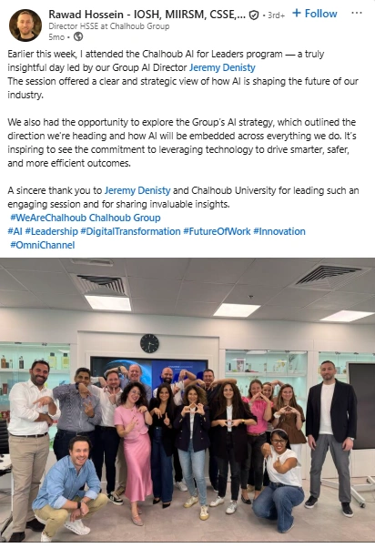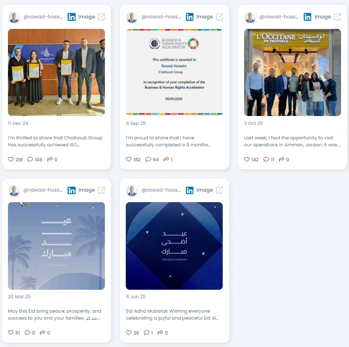 Rawad connects with a broad ecosystem of corporate leaders, retail operators, international agencies, and training partners. His visible ties include Chalhoub Group, program partners shown in his posts, and interactions with industry trainers and external advisors. He often appears alongside senior colleagues, cross-border teams, and external experts, showing reach that spans operations, compliance, and leadership networks.