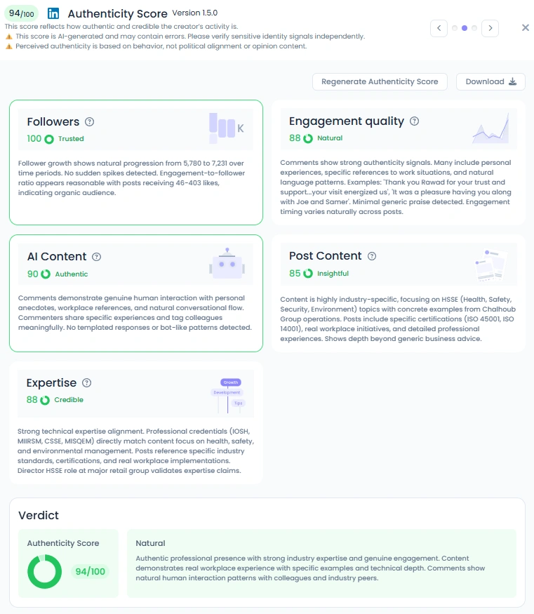 Favikon scores Rawad 94 out of 100 for authenticity. His activity shows natural human engagement, thoughtful comments, and post content rooted in real workplace initiatives. He shares team photos, certification wins, and practical lessons, which makes his authority feel earned. The profile reads like a leader who is present in the work and proud to credit his teams.