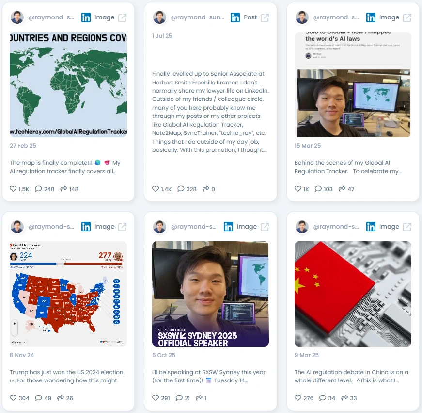 Raymond's most significant collaborations are rooted in his academic and professional life. His work with law firms and his creation of the Global AI Regulation Tracker are his key initiatives, demonstrating a form of collaboration with the legal and policy community itself. His appointment as an Official Speaker for SXSW Sydney 2025 is a major collaboration, positioning him on a global stage to share his expertise on AI policy. He also clearly references his colleagues and professional circle, showing deep integration within the legal and tech community.