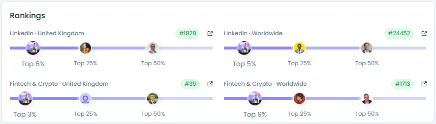 Reece has grown from 10,800 to more than 14,000 followers with consistent activity and strong professional visibility. His Influence Score sits at 6,872 points, placing him in the Top 6 percent of LinkedIn creators in the UK and the Top 5 percent in the Fintech and Crypto category. His posts regularly spark high-quality engagement, especially when he shares regulatory updates or partnership news. His content rhythm stays steady throughout the year with a balance of articles, images and event recaps.