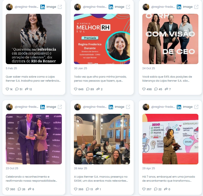Regina is deeply committed to Sustainability and Diversity and Inclusion, and these themes appear consistently across her content. She highlights women in leadership, celebrates internal achievements around representation, and shares tangible progress toward sustainable retail practices. Her posts often reflect the balance between environmental responsibility and human development, linking both to Renner’s long-term mission. She advocates for companies to lead with purpose and to build inclusive workplaces where people feel seen and supported.