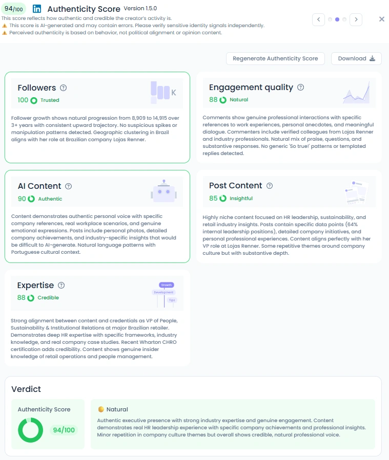 With a Favikon Authenticity Score of 94/100, Regina shows up online exactly as she is offline. She shares company milestones, team moments, speaking engagements, and personal reflections that clearly come from real lived experience. Her posts include natural language patterns, Portuguese cultural cues, and genuine appreciation for her team. This creates trust, especially in an industry where authenticity can easily get lost behind corporate messaging. Regina manages to be both an executive voice and a relatable human presence.