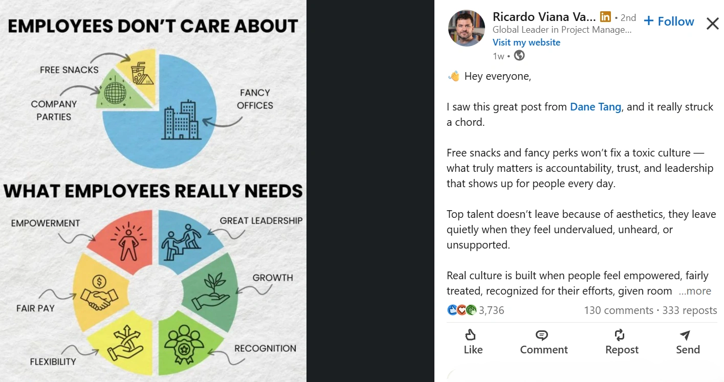 Ricardo’s communication style is straightforward and relatable. He explains complex project management and AI concepts with a conversational tone that makes them accessible to professionals at all levels. He mixes data with anecdotes, often referencing personal experiences, team stories, or even his daughter’s journey to Stanford, adding small human details that make his thought leadership feel authentic. Followers turn to him for clarity, but they stay for his sincerity.
