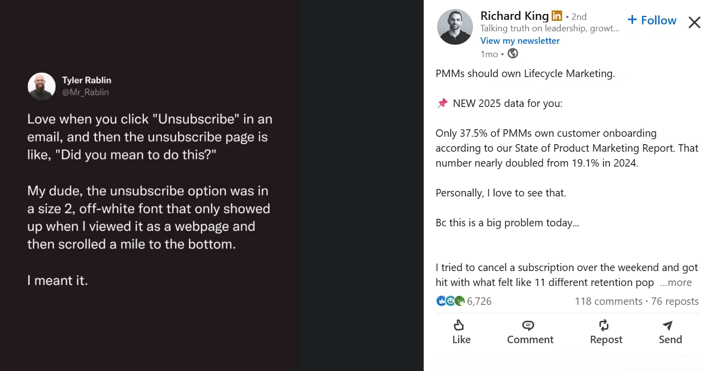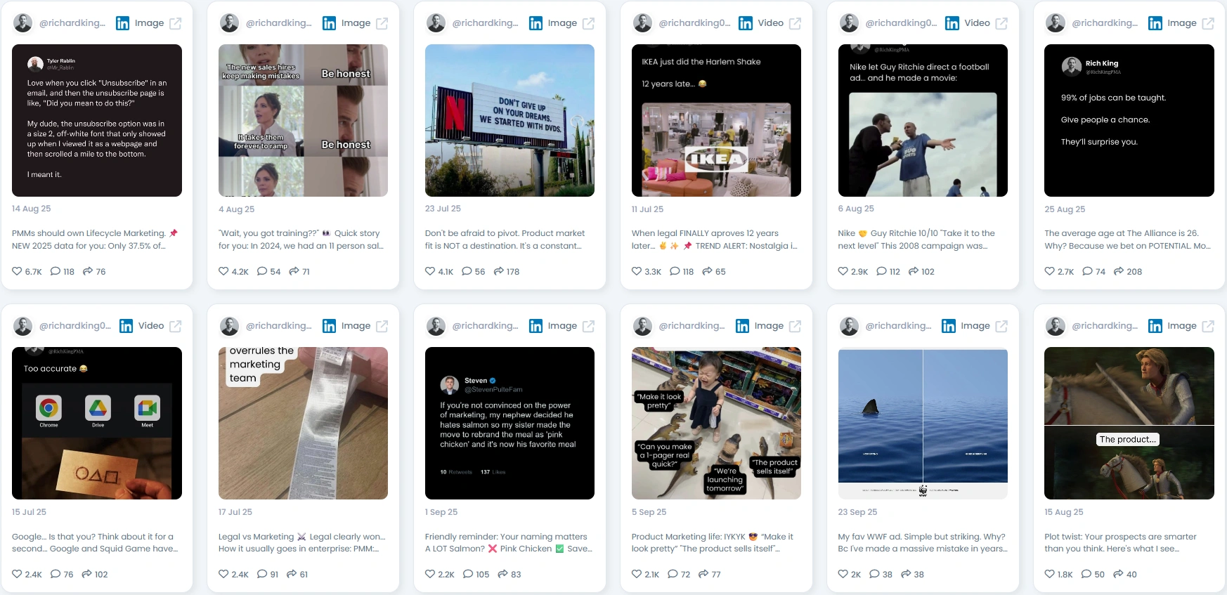 Richard King has become a go-to name in the product marketing world. Known for his sharp insights, humor, and practical frameworks, he’s one of those creators who can turn even niche marketing topics into engaging conversations.