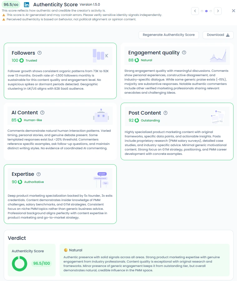 With a 96.5/100 Favikon Authenticity Score, Richard’s influence feels real. His posts are far from generic thought leadership. They are full of data, proprietary research, and stories from the trenches of product marketing. He doesn’t shy away from poking fun at the industry, often using humor as a way to get his point across. Whether it’s a witty meme or a case study breakdown, his content is consistently human, engaging, and trustworthy.