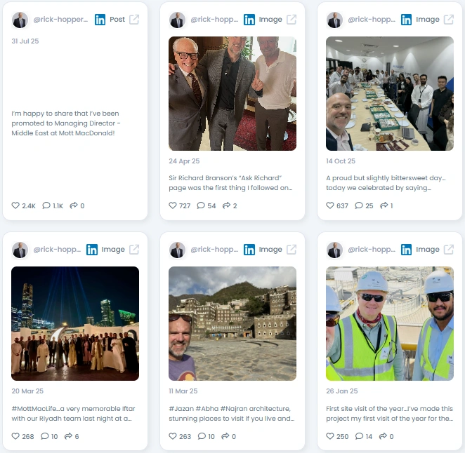 Rick’s circle includes Mott MacDonald leaders and project partners across Saudi Arabia and the wider Middle East. He engages with institutions such as APM and CIOB, plus senior voices in construction, urbanism, and government programs tied to Vision 2030. His gallery features on-site moments with executives, client delegations, and global business figures, signaling high-trust access. The network effect is clear. It anchors his credibility with decision-makers who influence policy, funding, and delivery.